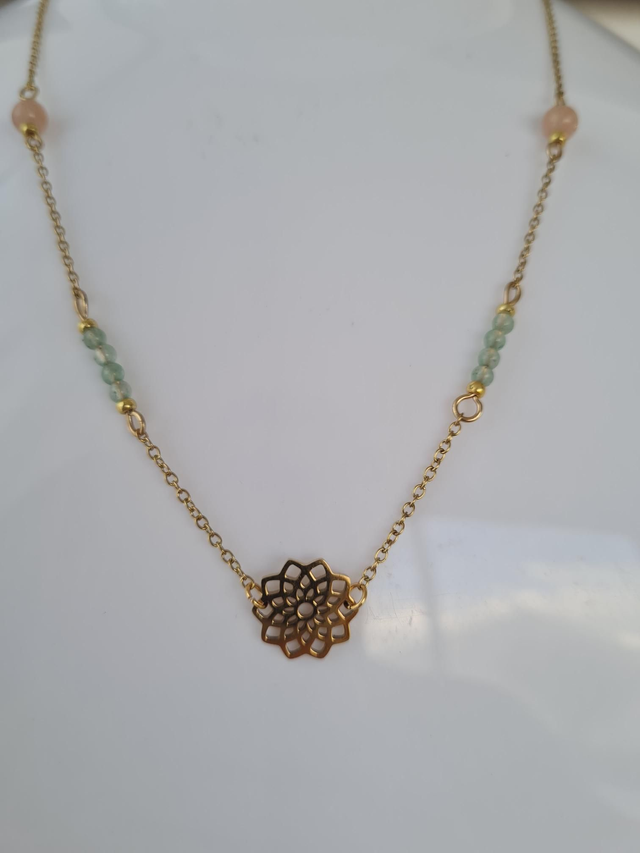 Collier en acier inoxydable doré et pierre naturelle aventurine verte et pierre de soleil.